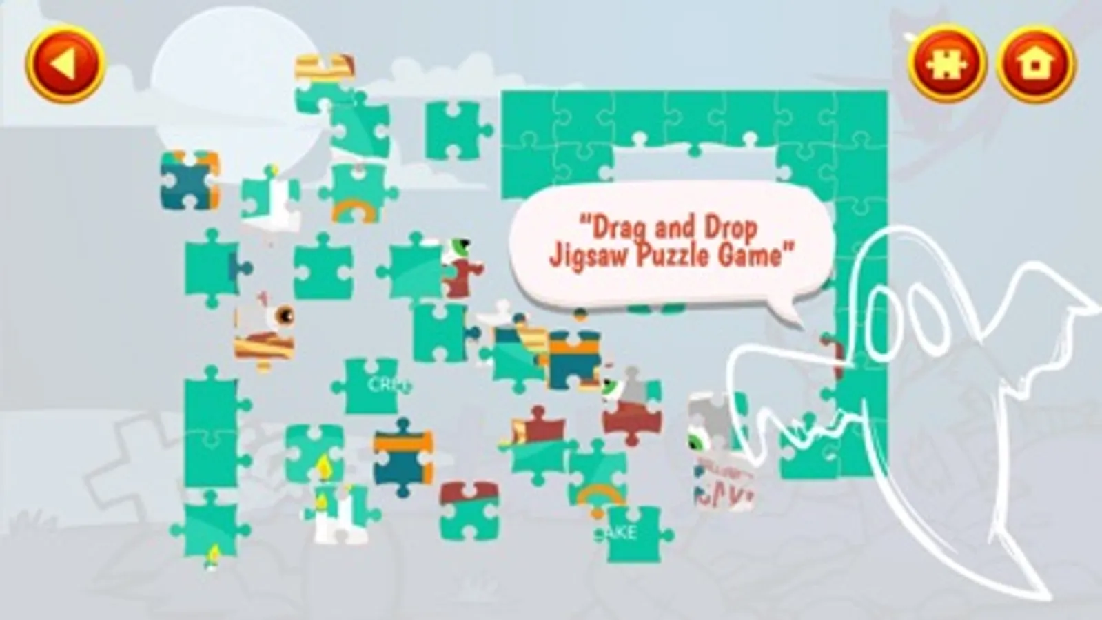 Jigsaw Puzzle Halloween Night works almost like real jigsaw puzzle for kids. Once your pick a piece it stays on the board even if you place it incorrectly, and you can nudge piece around until it snaps to the right slot.