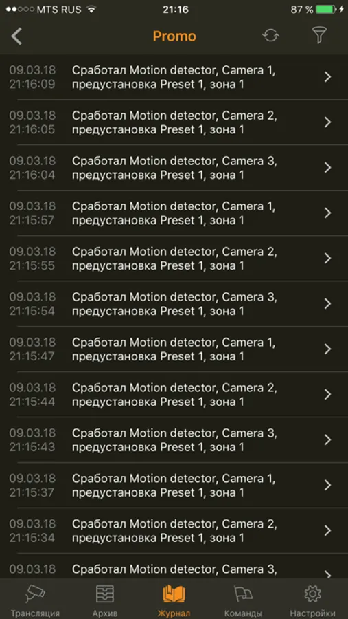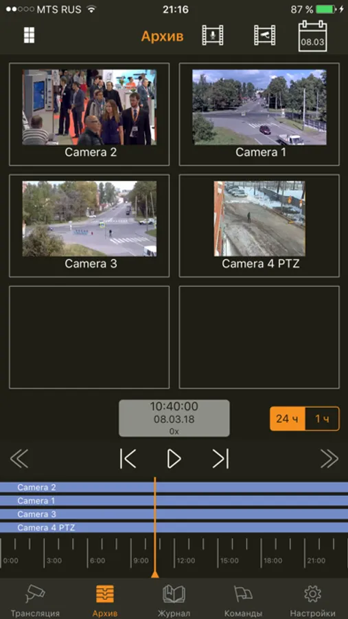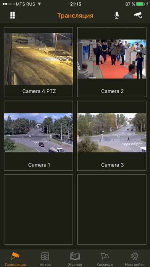- Просматривать трансляцию видео и звука по одной или одновременно по нескольким камерам;