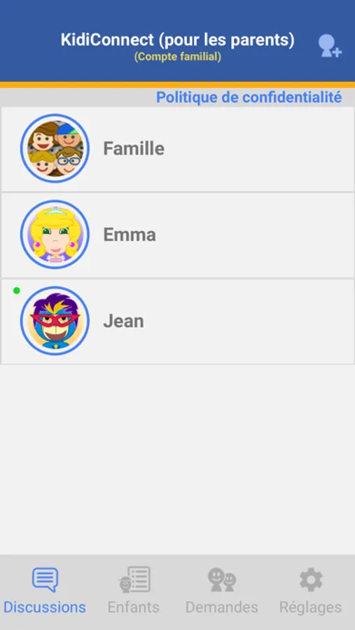 Le parent qui gère le compte est automatiquement ajouté à la liste d'amis de l'enfant. L'autre parent devra s'inscrire à KidiConnect (pour les parents), créer un compte séparé et demander à être ajouté à la liste d'amis de l'enfant.