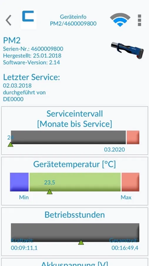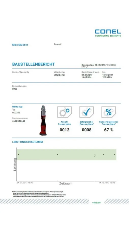 The ConelCheck App connects to the CONEL press machine PM2 via Bluetooth, so that device-related data can be retrieved and transferred to the app. With the ConelCheck App, the installer can check the device status automatically and thereby recognize whether the device is functioning properly. In addition, the logbook can be read out and the implemented report function can be used to document the executed cycles by generating a construction site report. This is stored in the app and can be retrieved at any time and sent by e-mail or printed out.