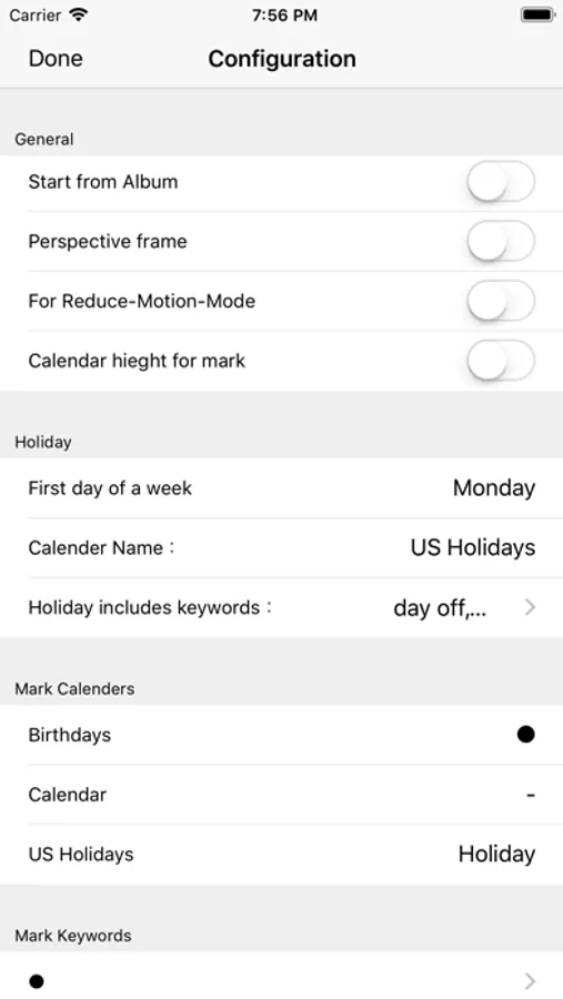 - Multiple calendar for holidays can be set. It can also be set as a holiday with a keywords string written on the Calendar-app such as "paid leave".
