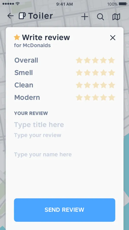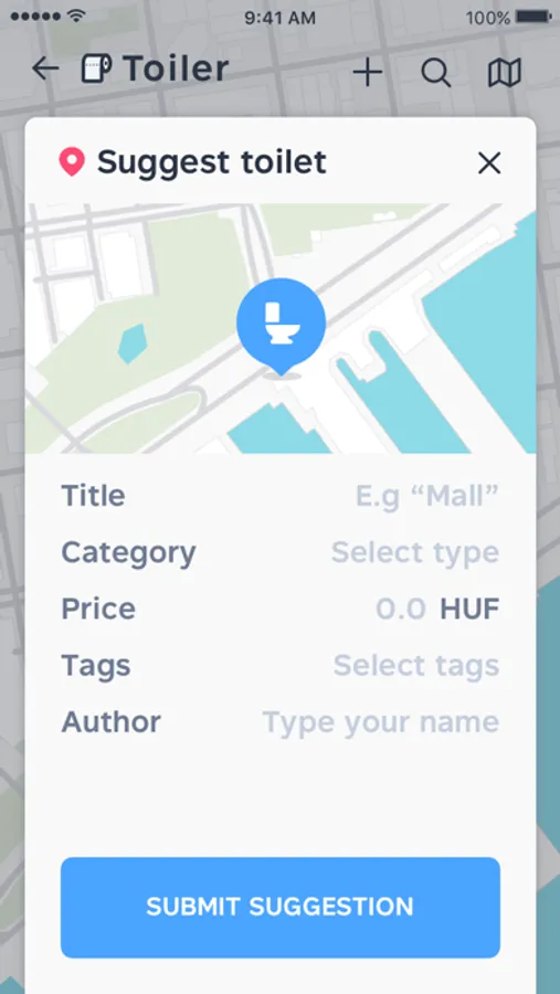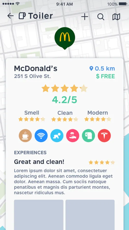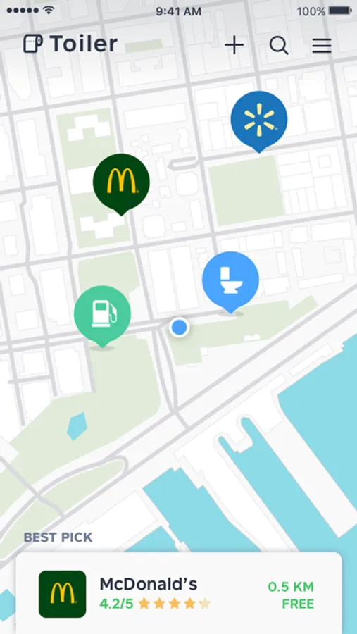 Toiler, the easy-to-use worldwide interactive toilet finder and rater social app helps you find nearby toilets. Details, such as distance, price, ratings and reviews from users and our custom made toilet recommendation algorithm which sorts toilets in categories such as "Best pick", "Closest" and "Nicest", help you chose the right toilet for your needs.