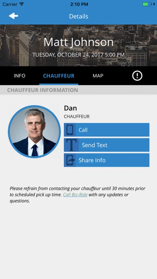 Having trouble locating your chauffeur? Left something in the vehicle? Service not up to your standards? CALL US! We are here for you 24/7 to provide support. In this world full of technology, people still matter. Download BizRide today!