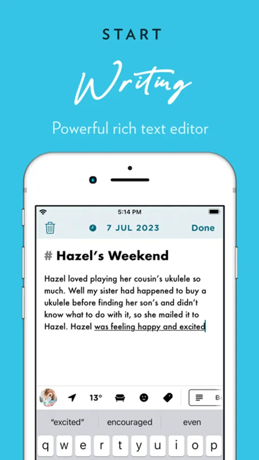 Take note of your feelings while journaling and keep track of how your mood fluctuates across your journal entries. View how your mood shifts across 30 days in your stories.