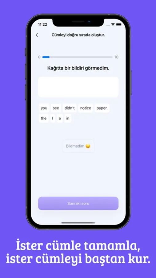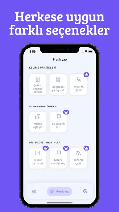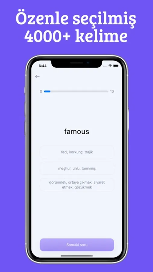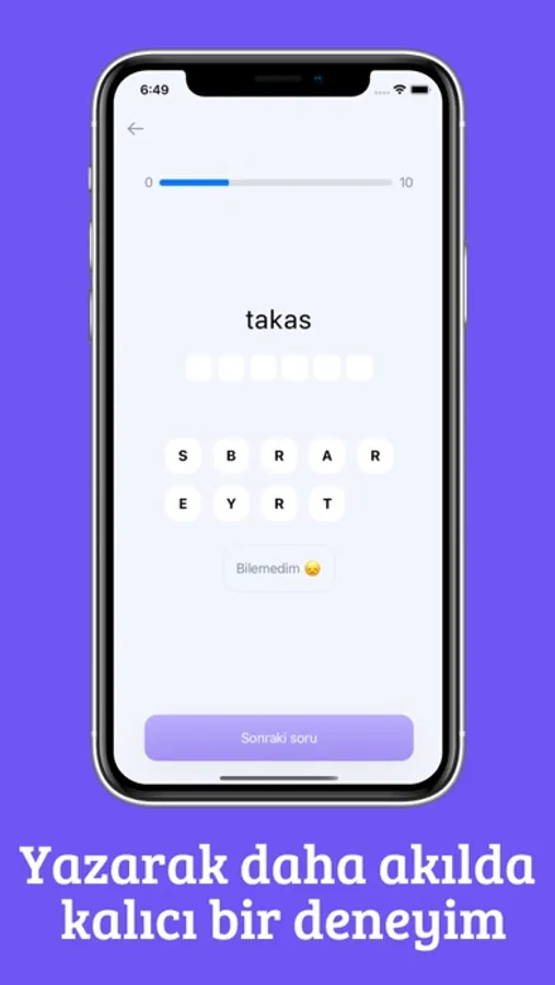 * Sadece kelime bilgisi üzerine sınırlı kalmayıp, cümle bilgini de pratikleştirmen çok kolay. Birbirinden farklı soru tipleri ile cümle kurma bilgini de geliştirebilirsin.