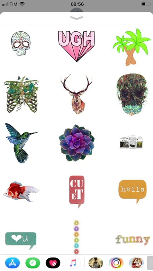 Open any message you have and at the bottom of the screen, you will see buttons of your app list out. If you saw this app, please tap on it and the stickers collection will show up, if not, please slide to the left to find this app.Â
