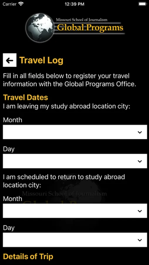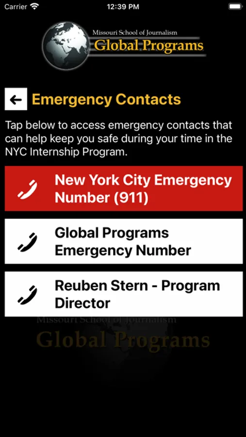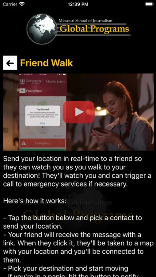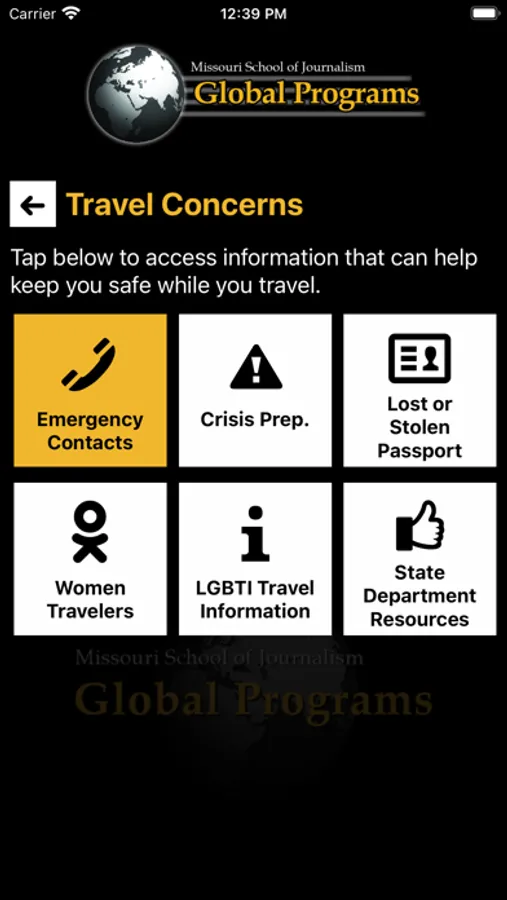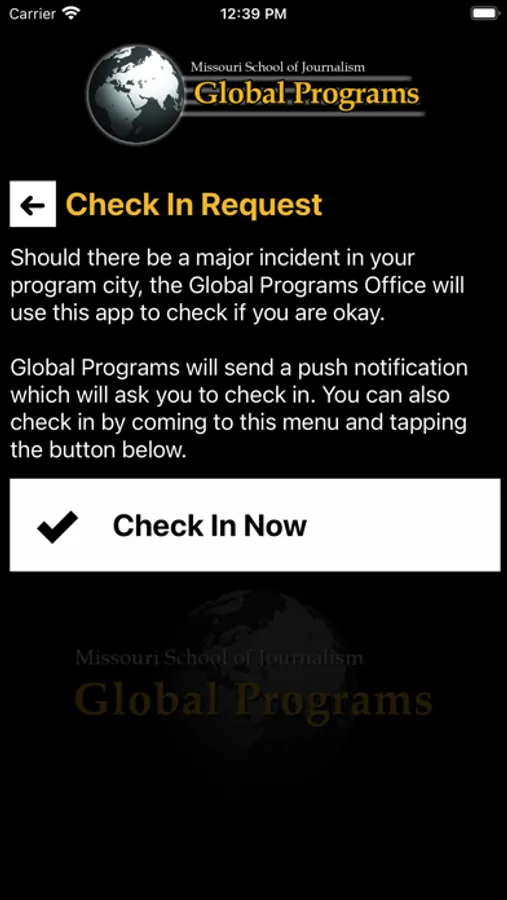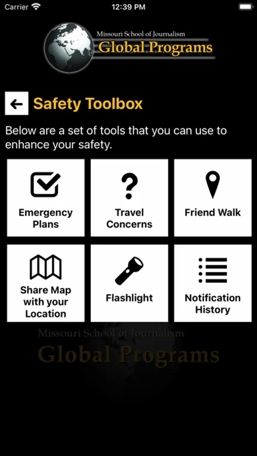 TravelSafe is the official travel safety app of Missouri School of Journalism Global Programs office. The Global Programs Office has worked to develop a unique app that provides students with added safety as they travel abroad. The app will ask you to check in in case of an emergency in your area, send you important safety alerts, and provide instant access to safety resources for your internship location.