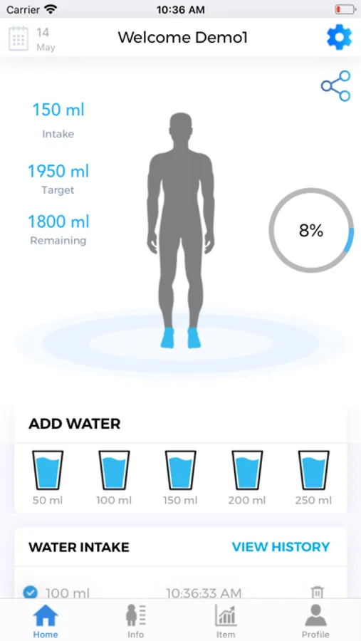 Here we set water intake target using standard algorithm of water intake bases on your body weight, age and lifestyle. Revs up metabolism and helps you feel full.