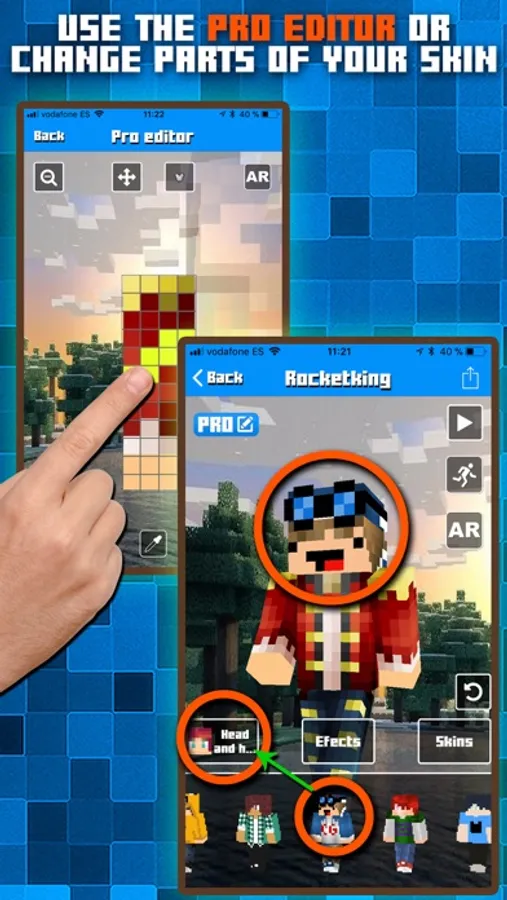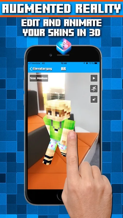 With Skins AR for Minecraft, you can download hundreds of skins and apply it to your Minecraft character. You can also automatically export them to your Minecraft without having to save them to the reel. It's the only app where you can do it right now.