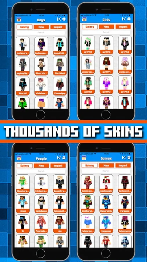 All skins are organized by categories so you can do better your searches (New, Top, Girls, Boys, Animals, Heroes, Love, Professions, Games, People, Fantasy, Mobs ...)