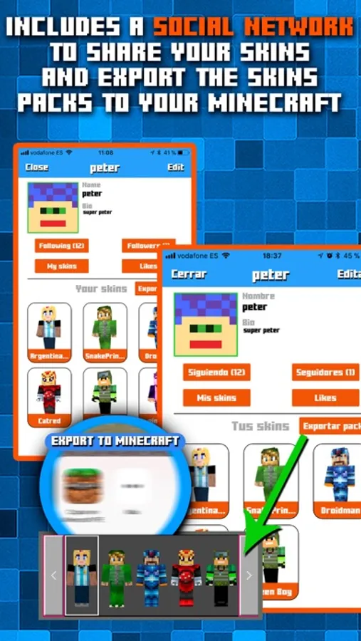 - Full integration with Minecraft, export all your skins as a Pack directly into your Minecraft app (save saving them on your reel)