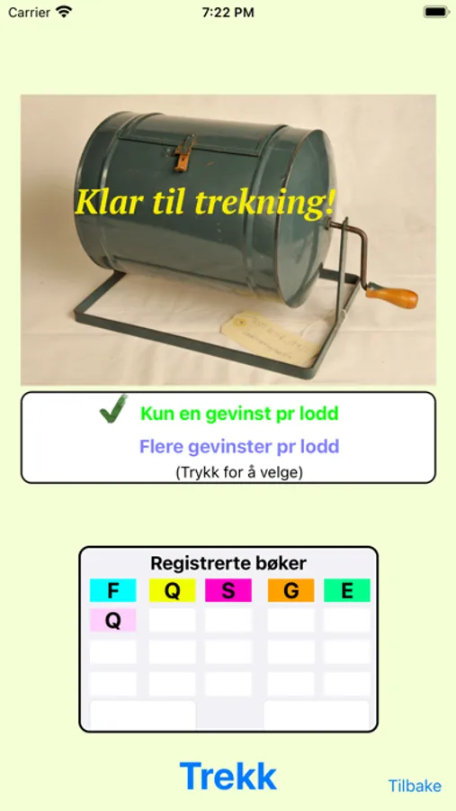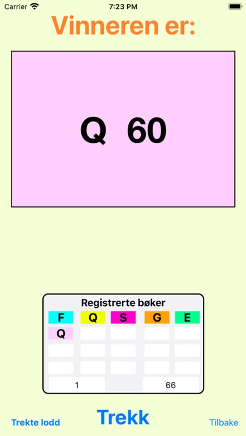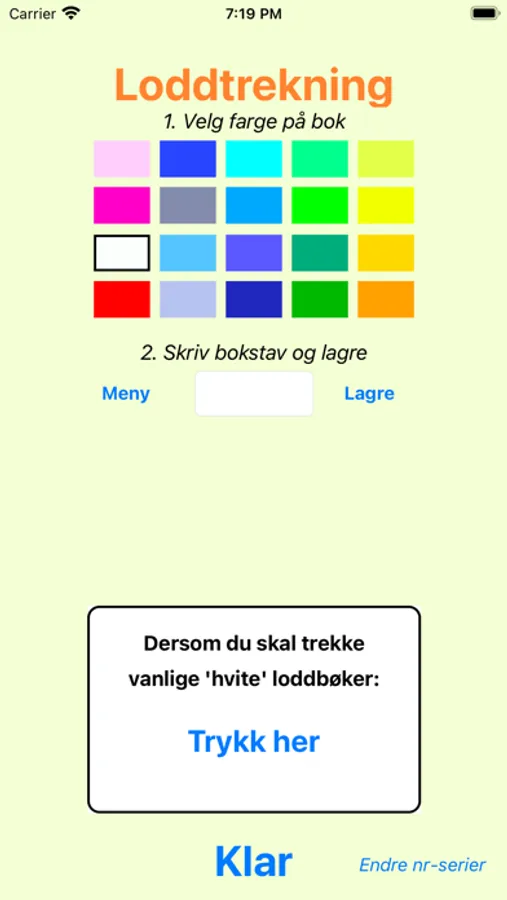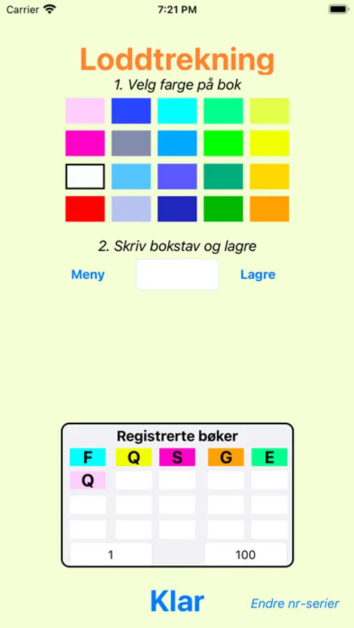 a) Har du 7 loddbøker som skal trekkes legger du inn bøkene med Farge og Bokstav.