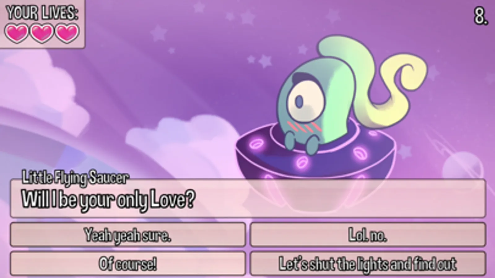 Intergalactic Love Machine is an impossible dating sim. You play as Chip, the spaceman who is ready to meet and seduce every creature in the galaxy. Grind your way through hard questions and earn your title as ultimate playboy.