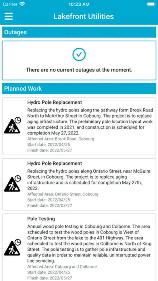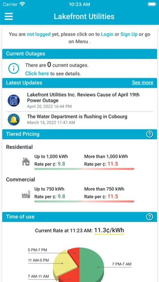 The Lakefront app displays planned and unplanned outage details, including a map of the affected area and notifies customers of current power outages within the service territory. Lakefront customers can also report a currently active outage. The Lakefront App focuses on energy education, with incentivized conservation programs to help manage energy usage and costs.