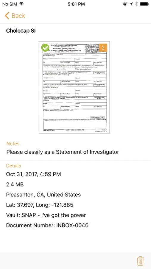 Veeva Snap is a complementary application to the full Veeva Vault application. It provides the capability for users to scan paper documents using the device camera, edit scanned pages and apply image enhancements technology to generate a complete document that is uploaded directly into the Veeva Vault.