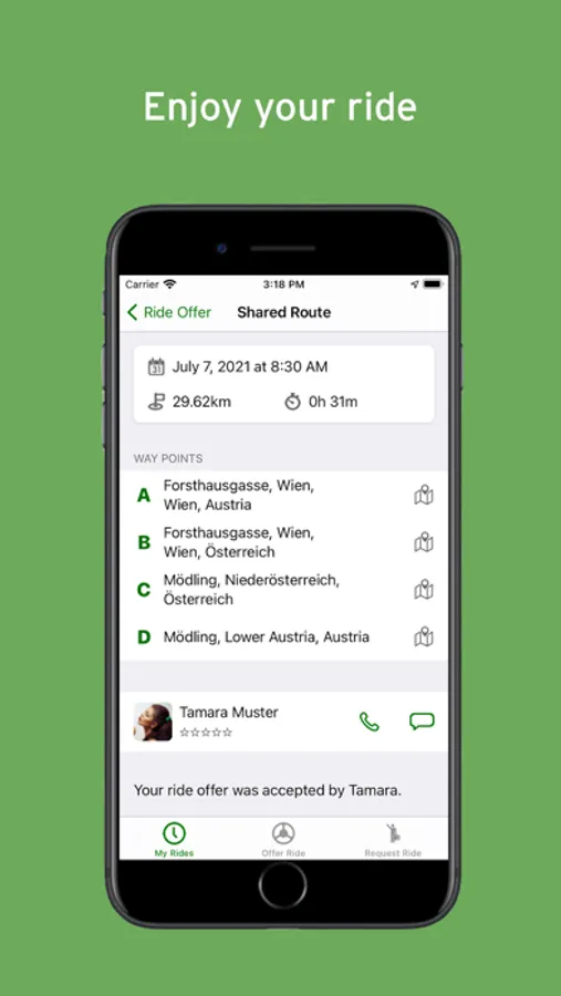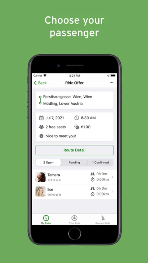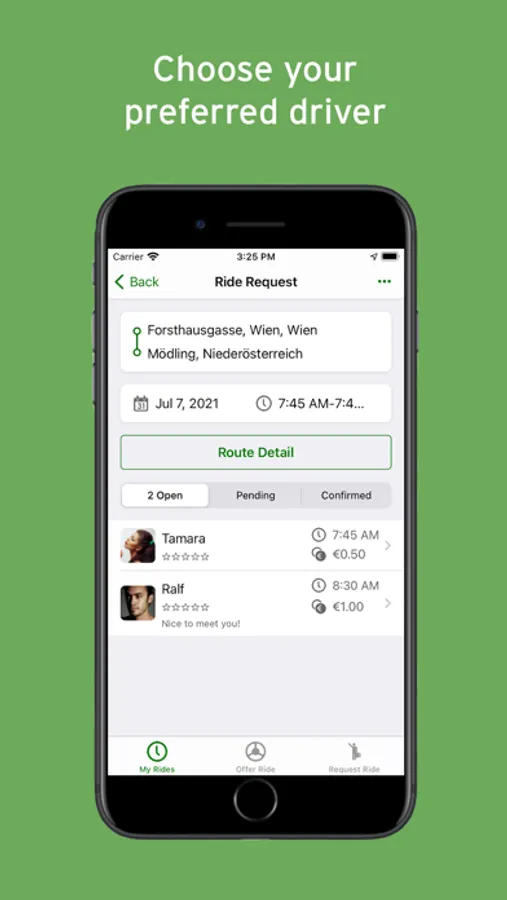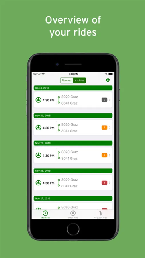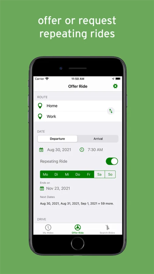 Using Greendrive is totally free and the service is perfectly suited for commuters: Enter your daily way to work once as a recurring schedule. Discover spontaneous rides home on demand just as easily.