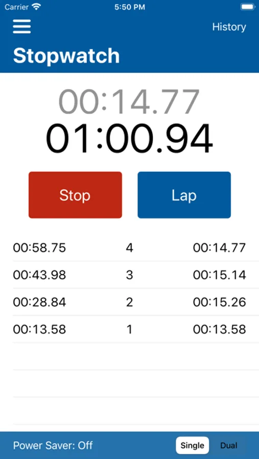 Neon Swim includes the best stopwatch for swimming. It is intuitive and lists splits. The stopwatch can even be paused and resumed. It also Includes a low power mode that dramatically reduces energy usage allowing all day use of the stopwatch without having to worry about running out of battery.