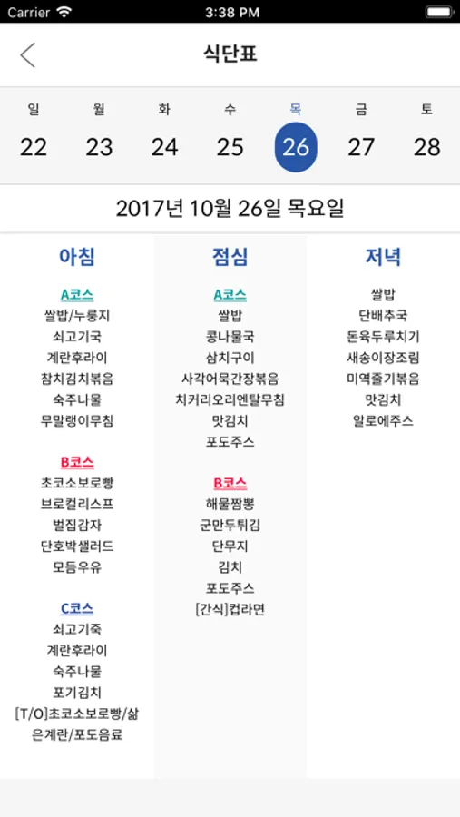 한주간의 생활관 식당의 식단정보를 볼 수 있는 '식단정보' 기능