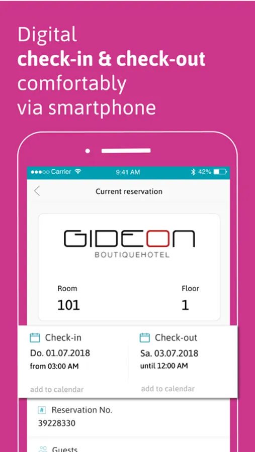 Long waiting times and long queues at the reception for check-in and check-out are now a thing of the past. Be smart and use our app with the following features: