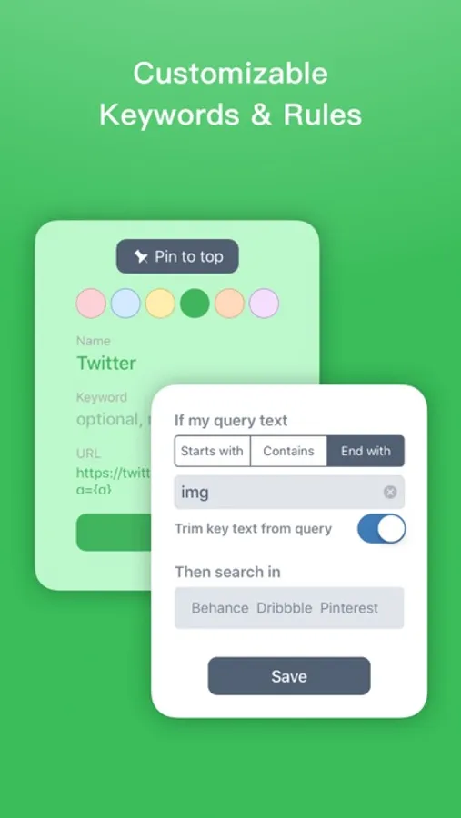 Specify target websites with your text input, without leaving the keyboard. e.g. If query text has keyword ‘buy’, then search on Amazon, eBay, Etsy and Best Buy.