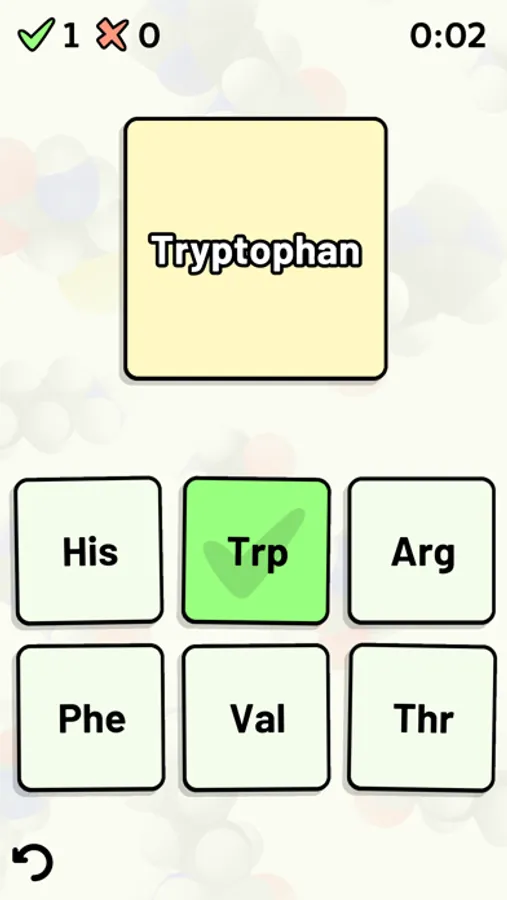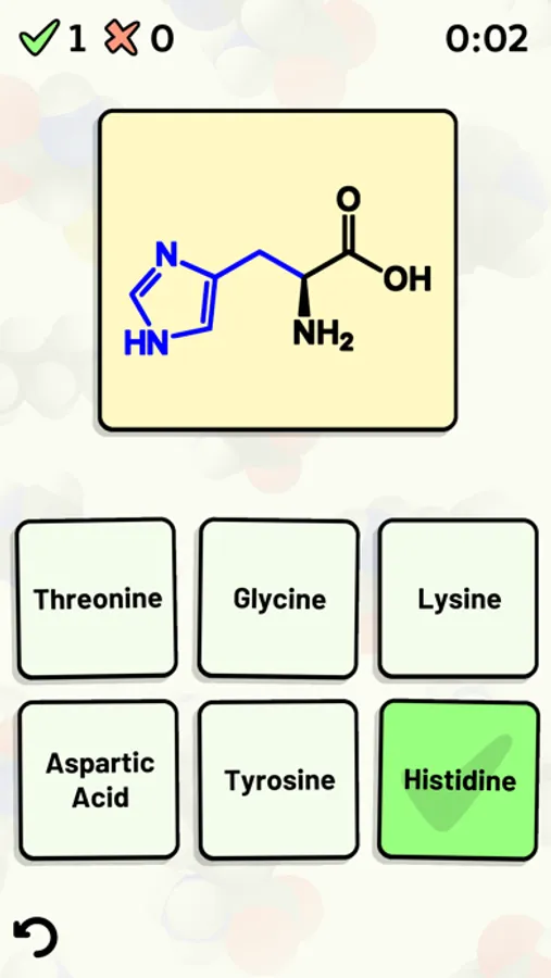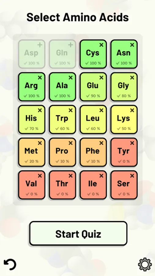 Test and improve your knowledge of the 20 standard amino acids using this app's customizable quizzes.