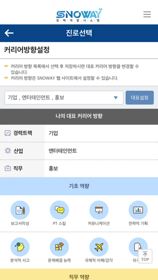 SNOWAY 시스템은 학생이 목표 경력을 설정하면, 목표 경력을 달성하기 위해 필요한 직무역량과 직무역량을 향상시킬 수 있는 활동을 제시합니다.