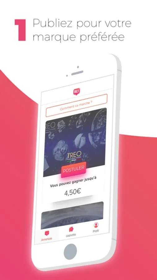 Bily vous permet de gagner de l'argent grâce à vos publications sur les différents réseaux sociaux. Bily est une plateforme qui met en relation les marques avec les utilisateurs de l'application Bily. Pour commencer, vous choisissez une marque pour laquelle vous souhaitez publier. Vous recevrez alors une rémunération en fonction de la portée de votre post. Soyez original et créatif. Le service est accessible à tout le monde peu importe l'importance de votre communauté sur les réseaux sociaux.