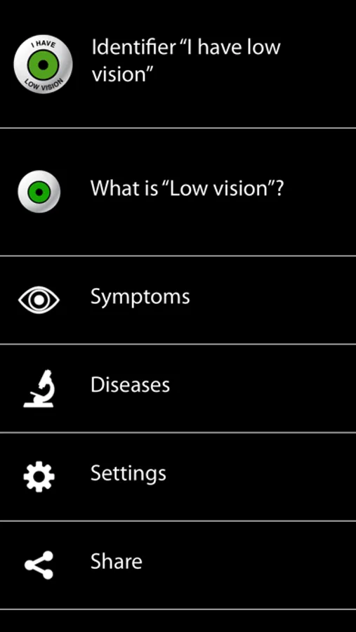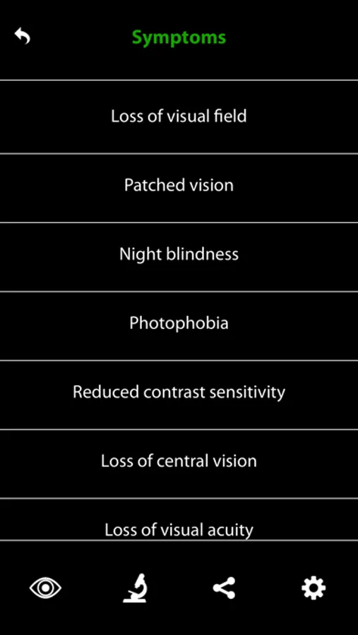 The application matches some of the diseases that cause severe visual impairment (retinitis pigmentosa, glaucoma, AMD, Stargardt disease, diabetic retinopathy, high degree myopia and albinism) with the simulated symptoms.