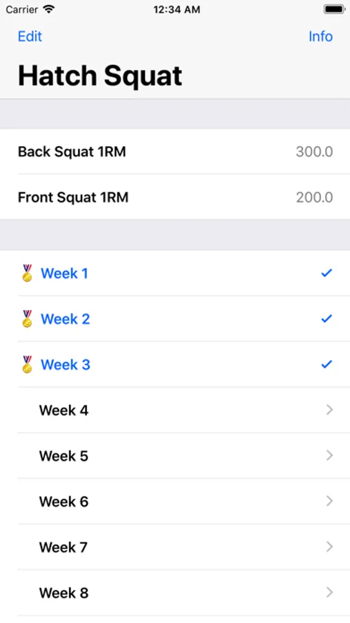 Stop using old school spreadsheets and print out. This app will automatically calculate the weights at specific reps and sets that you should use based on the 12 week Hatch Squat program. Easily keep track of your workouts each week for both the back and front squat portions.