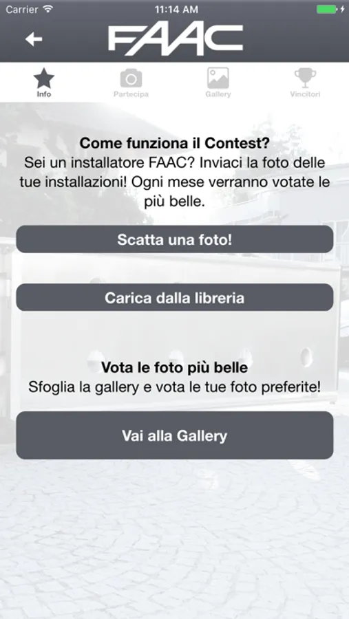 Gli utenti possono accedere ad un’area contest , da cui inviare le foto delle installazioni realizzate con prodotti FAAC. Inoltre è possibile localizzare tutti i centri di assistenza ed i distributori autorizzati presenti sul territorio nazionale.