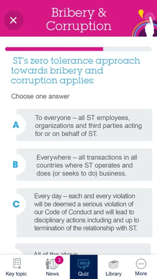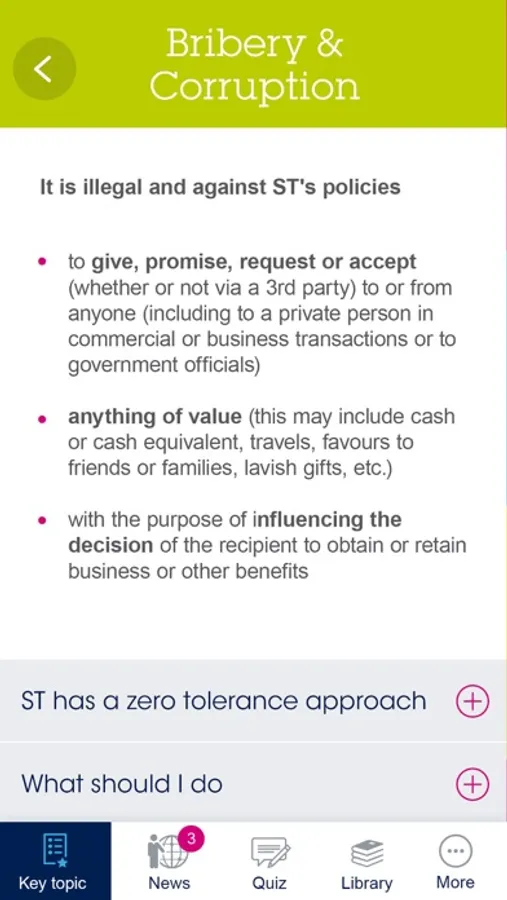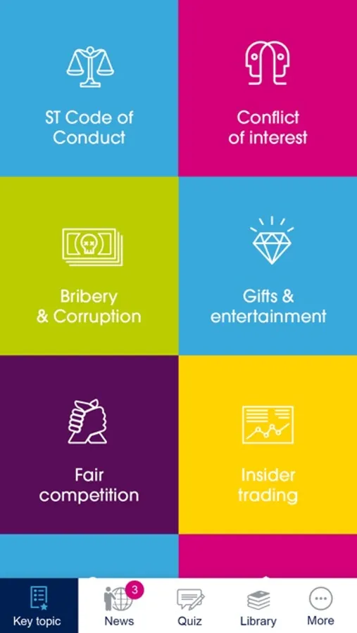 Our Compliance & Ethics department has developed the ST Integrity App in order to help all STMicroelectronics’ employees to easily access useful information and resources on key topics contained in our Code of Conduct. The ST Integrity App also allows ST employees to test their knowledge with short quizzes, and to stay up-to-date with the latest news and developments in the field of Compliance & Ethics. It also provides easy access to our Misconduct Reporting Hotline, for those who need to Speak up.
