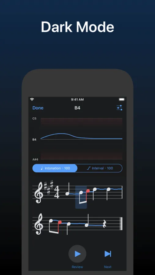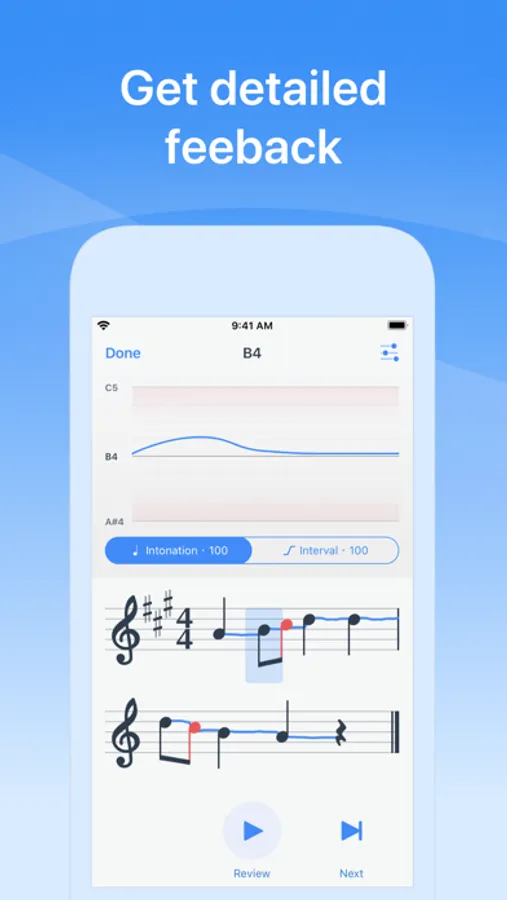 Ella gives you a detailed analysis of your performance on intonation and intervals and lets you further visualize it through graphs. The intonation score is based on how accurately you sang the pitch of each note. The interval score is based on how accurately you sang each interval.