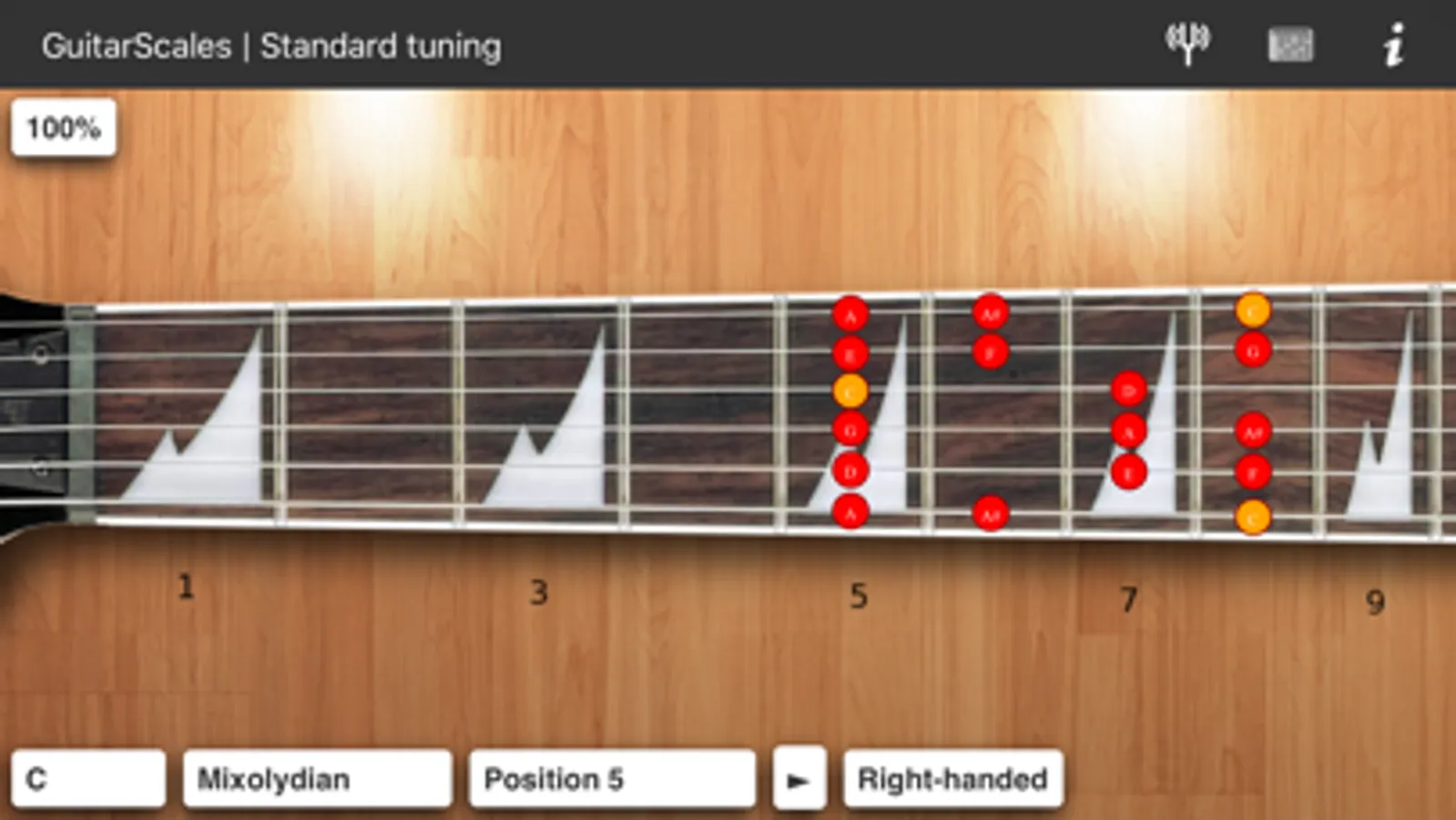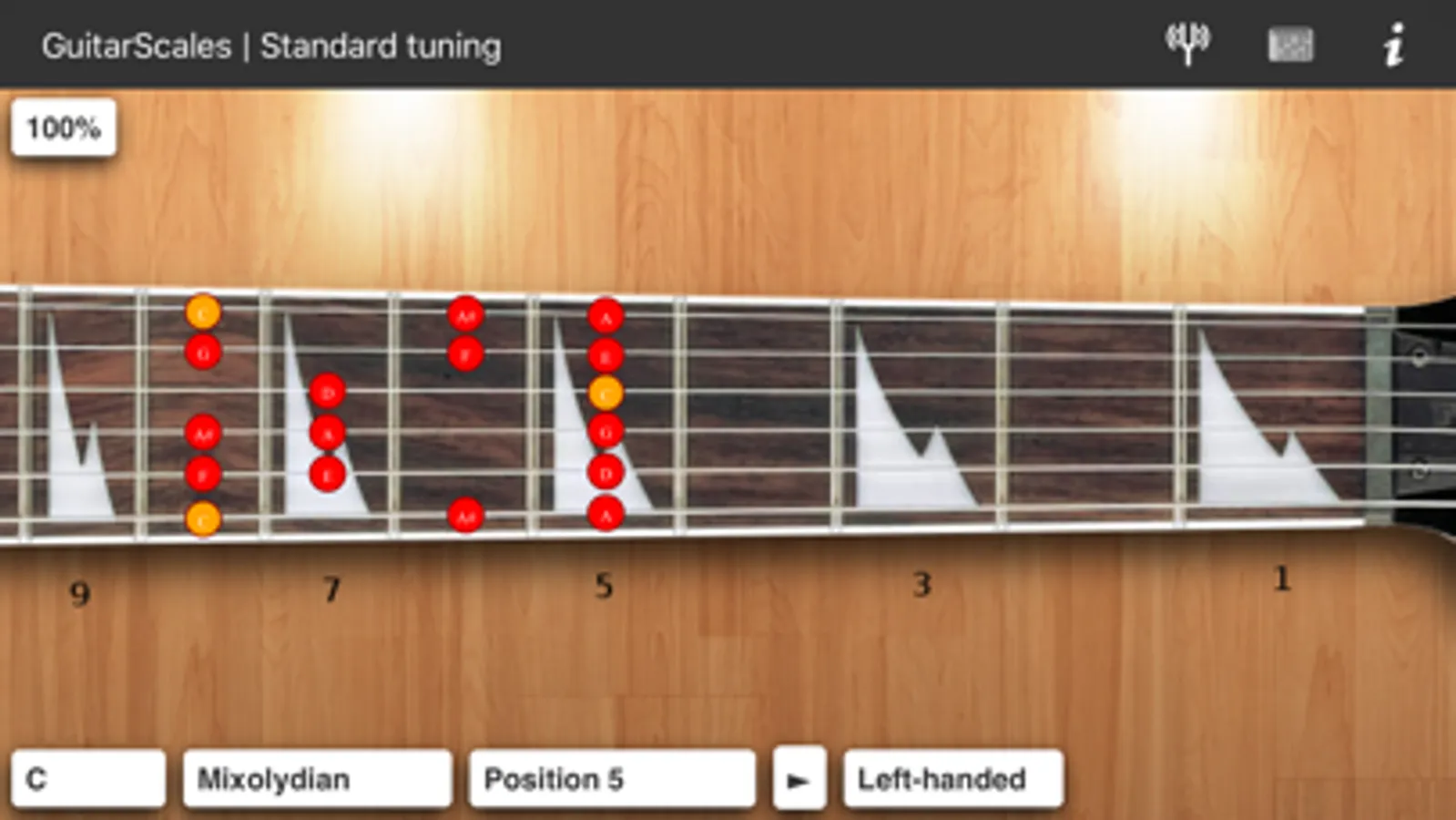 GuitarScales is a free iOS application for learning guitar scales and memorize the notes on the guitar fretboard. It contains chromatic, Ionian (major), harmonic major, Dorian, Phrygian, Lydian, Mixolydian, Aeolian (minor), Locrian, harmonic minor, major pentatonic, minor pentatonic, blues pentatonic, Hungarian Gypsy, Ukrainian Dorian, Acoustic, Persian, Algerian, Flamenco, Hawaiian, Chinese, Byzantine and Neopolitan scales.