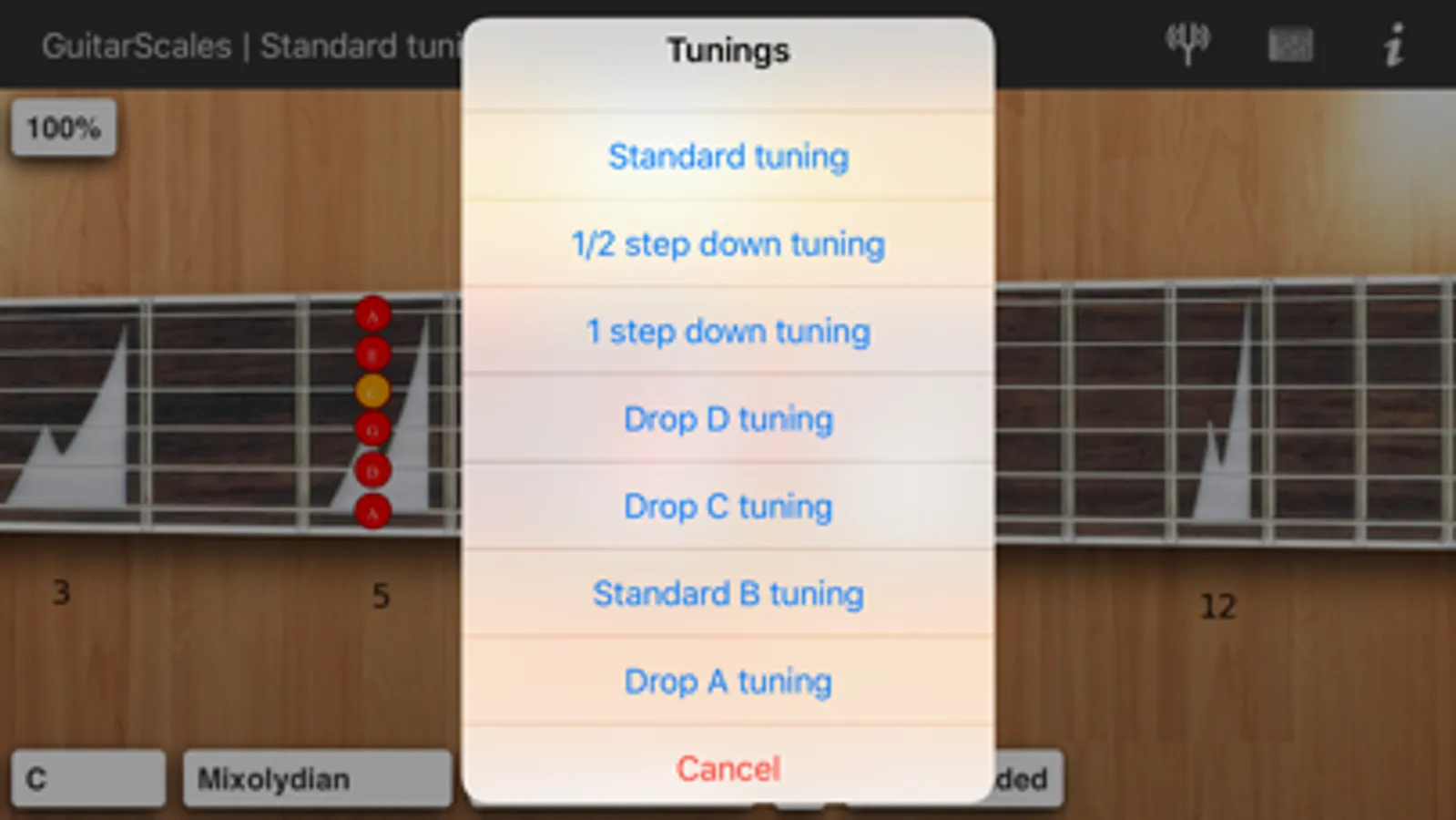 Guitar Scales app contains scales for standard, 1/2 step down, 1 step down, standard B, drop D, drop C and drop A tunings.