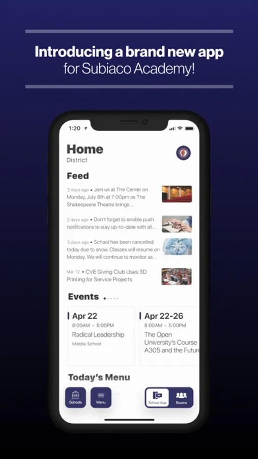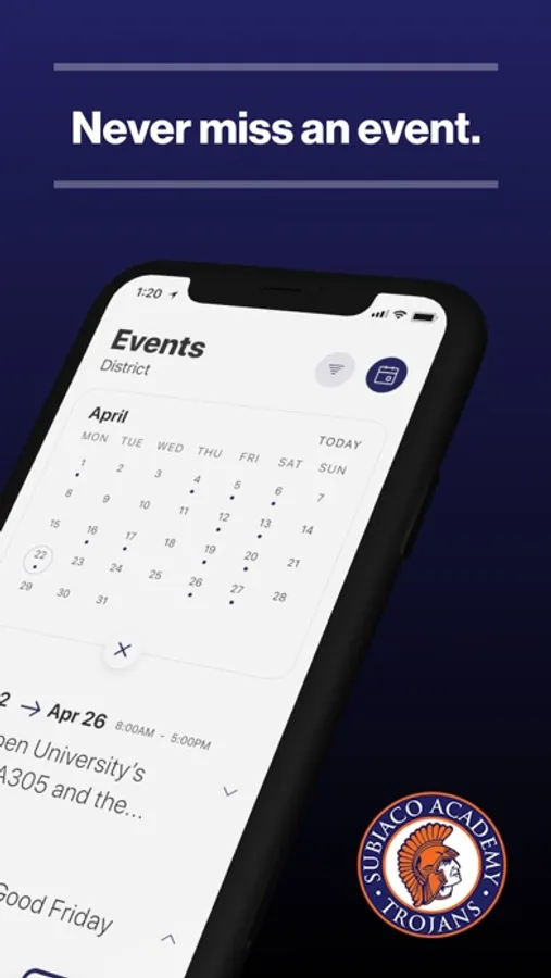 The event section shows a list of events throughout the school. Users can add an event to their calendar to share the event with friends and family with one tap.