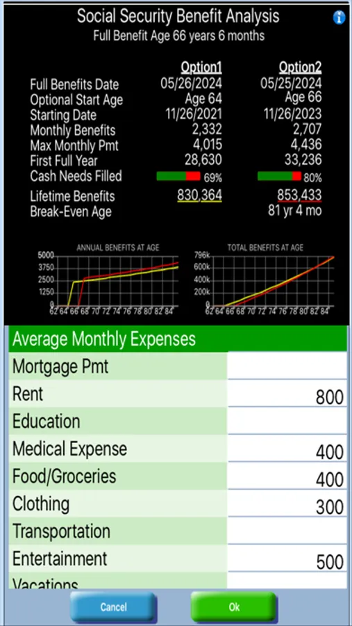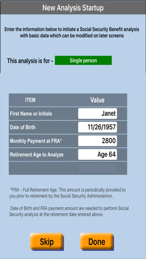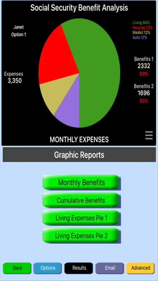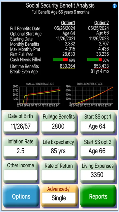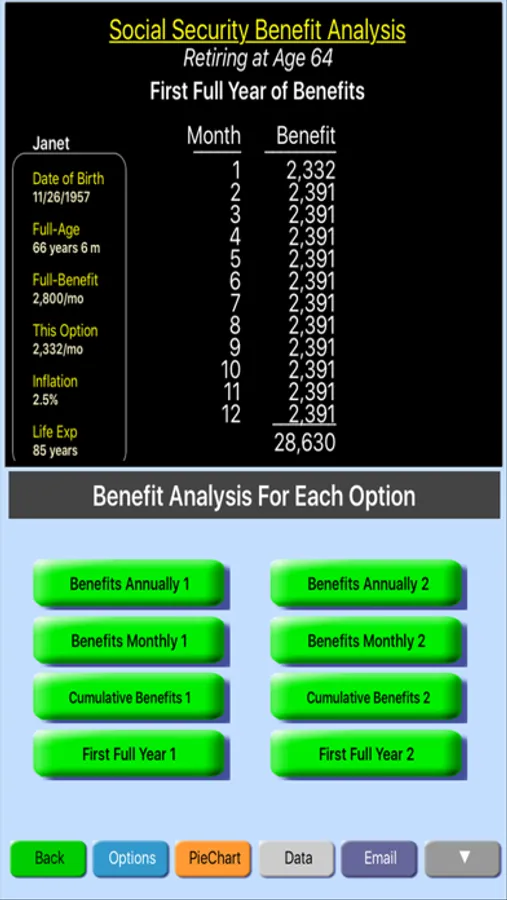 Analysis with Boss is quick and simple. All you need for an essential analysis is a birth date and the benefit amount at full retirement age (FRA). The Social Security Administration provides the FRA amount to social security payers periodically. With these two data items entered you are ready to analyze. Pick an eligible month and year to view benefit details. Enter different option and view the comparative results and line graphs for an easier grasp of projected results. This simple exercise can now be expanded with other factors such as the inflation rate, life expectancy, rate-of-return, expenses and tax related information.
