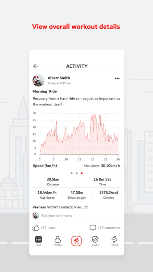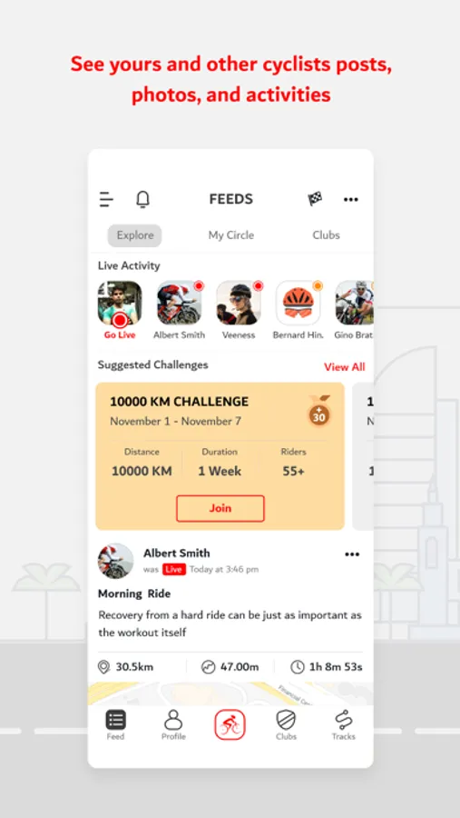 • The feed page shows all the activities of the user, (including the track) which is recorded by the app (on its own or using other wearable devices or by manual entry). The user can also share his posts