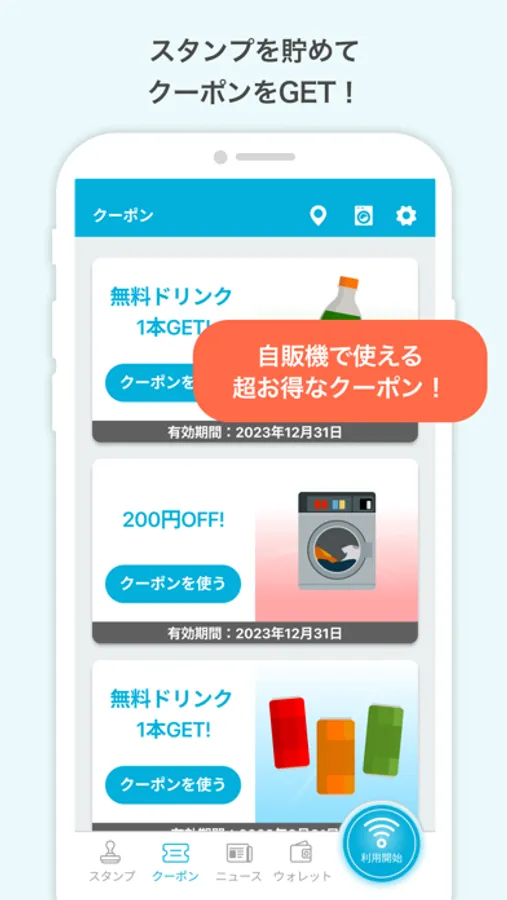 対応自販機の前で、アプリを開き「利用開始」ボタンを押すと、自販機と接続します。