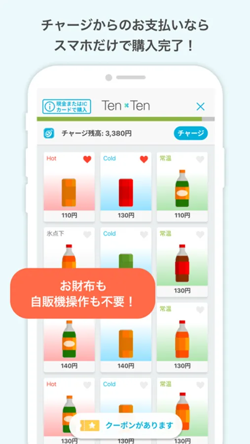 チャージ残高があると、接続した自販機の商品が一覧で表示され、アプリで商品選択から購入までできます。