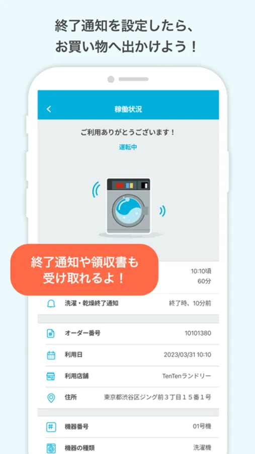 完了通知設定や領収証発行もアプリで簡単にできます。