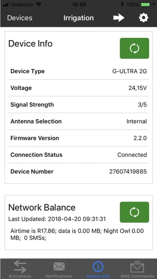 • The G-REMOTE app boasts a dedicated screen displaying critical system information such as airtime balances and device signal strength.