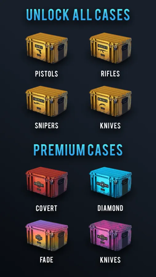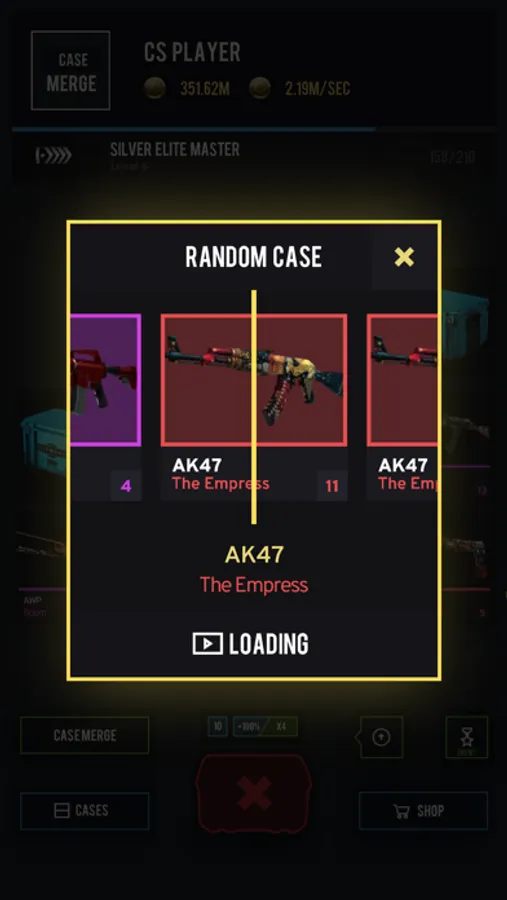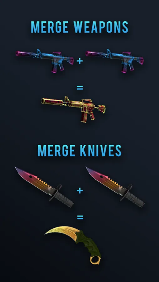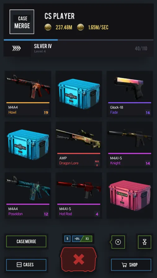 Case Merge - Case Simulator, Opener & Upgrader is based on popular Counter Strike Global Offensive shooter and skins game. Aim of the Case Merge is to open cases to build top-notch inventory possible. By opening cases player collects XP to progress to better rank. App contains all csgo levels from Silver I, Gold Nova to Global Elite.