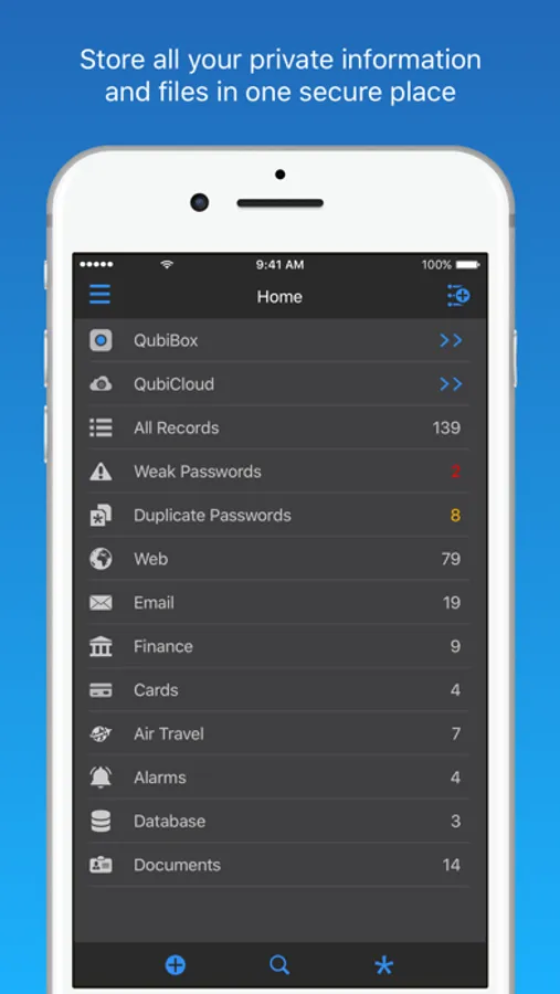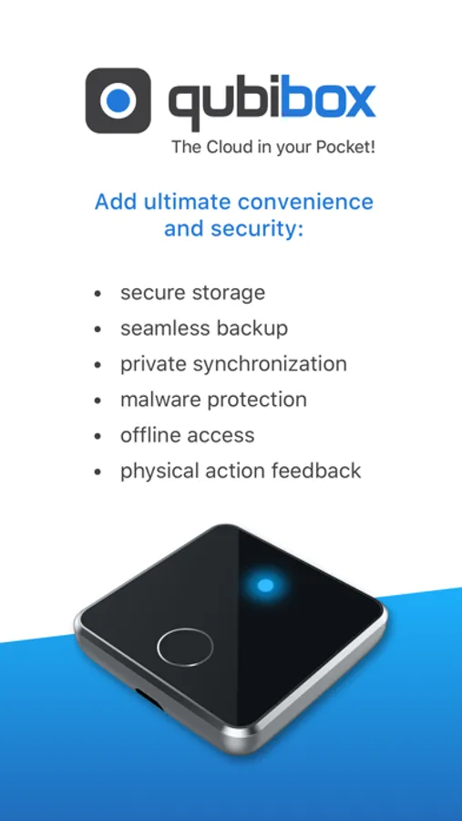 The QubiBox app is free for life, but you can expand the application’s convenience and security features with a one-time purchase of the QubiBox device, a small hardware device designed to protect your data from hackers, loss or accidental disclosure. With the QubiBox device you will be able to:
