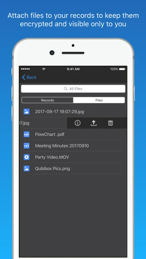- Attach images, movies or any other files to your records and keep them encrypted and accessible only to you