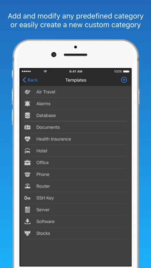 - Add and store your records in one of 17 predefined categories, or create your own using the simple category builder