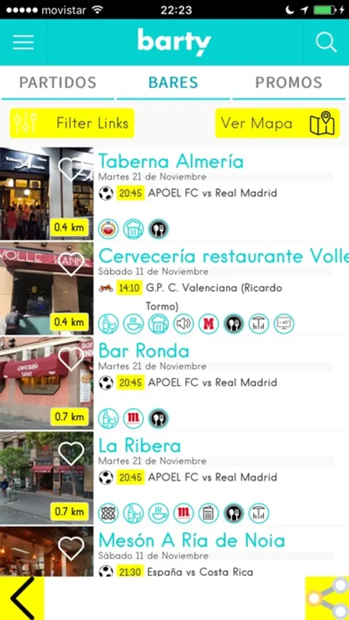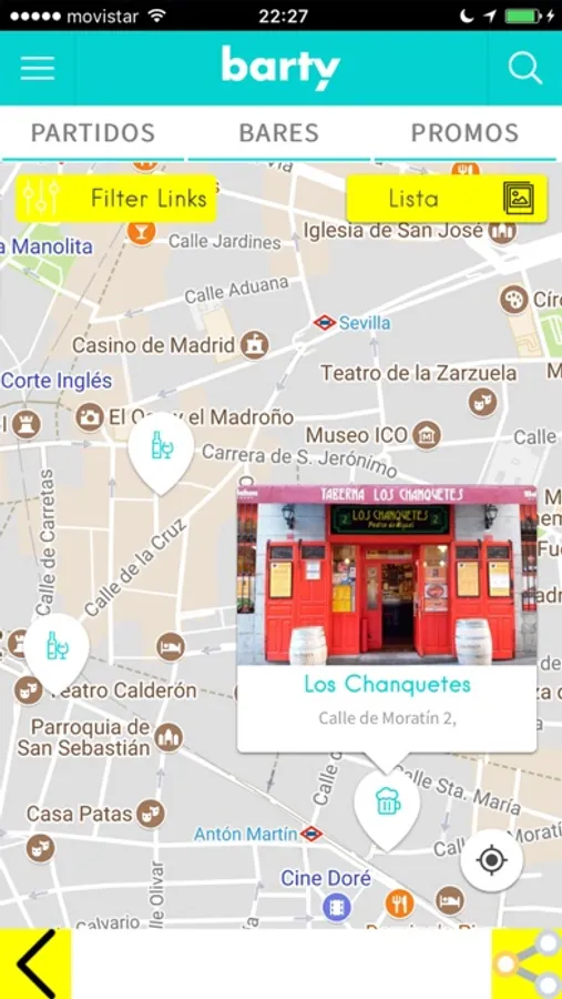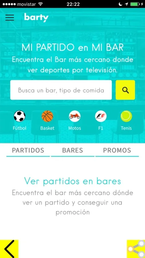 Barty o Bartyapp te permite localizar los bares que tienes cerca y que televisan el partido y deporte que estás buscando. Así podrás encontrar el bar o local que quieres con el partido que quieres ver. ¡Basta de ir al mismo sitio de siempre!
