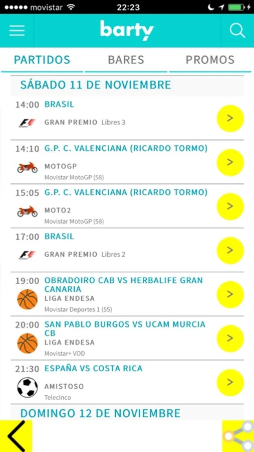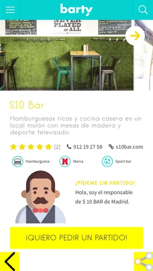 BARTY es una agenda ordenada de partidos y de bares, restaurantes, locales, pubs, cervecerías, sportbars, gimnasios que retransmiten partidos, competiciones, campeonatos por telecisión en sus espacios. PERO ADEMÁS...si nadie pone tlo que quieres ver en ese momento.. pues se lo pides directamente al encargado del bar desde "PEDIR PARTIDO". Fácil.