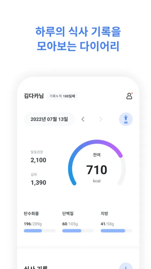 ∙ 오늘 하루 내가 먹으면 적정한 1일 권장 칼로리 대비 섭취한 칼로리, 잔여 칼로리를 활용하면 목표 체중에 한 걸음 다가서게 될 거예요.