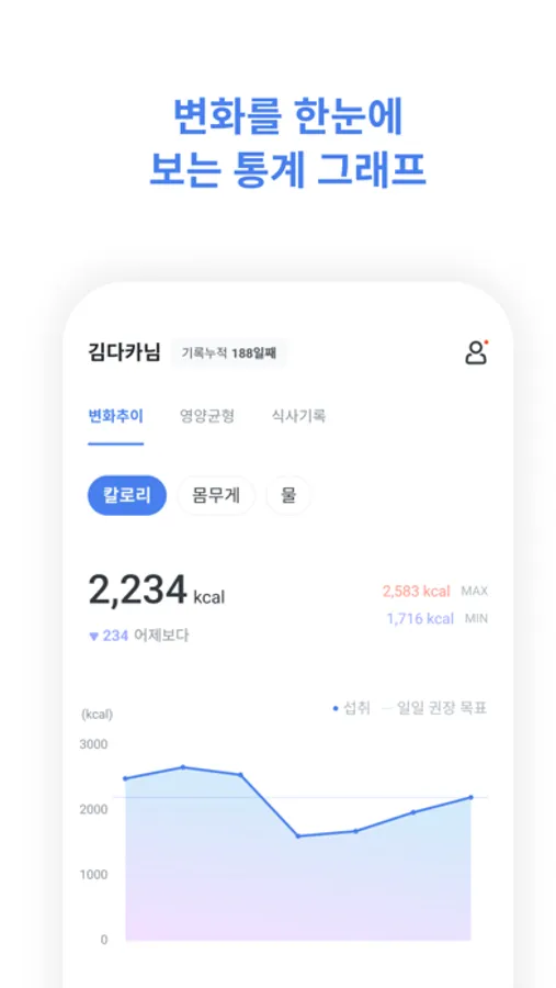 ∙ [변화추이]에서 칼로리/물 섭취와 몸무게 기록에 대하여 1주, 1달, 3달, 6달, 1년 그래프와 최저점, 최고점 수치를 확인할 수 있어요.