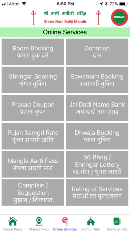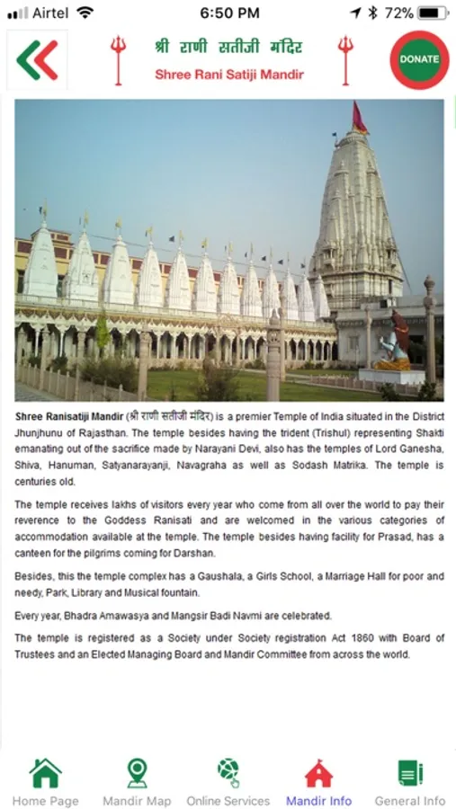 Shree Ranisatiji Mandir (राणी सती दादी मंदिर) is a premier Temple of India situated in the Jhunjhunu District of Rajasthan. The temple besides having the trident (Trishul) representing Shakti emanating out of the sacrifice made by Narayani Devi, also has the temples of Lord Ganesha, Shiva, Hanuman, Satyanarayanji, Navagraha as well as Sodas Matrika. The temple is centuries old.